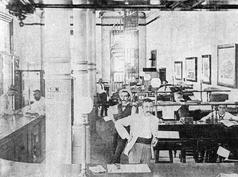 A black and white photo of a busy office or lab with multiple men working at desks, some standing and some sitting, with papers, books, and equipment on the tables.